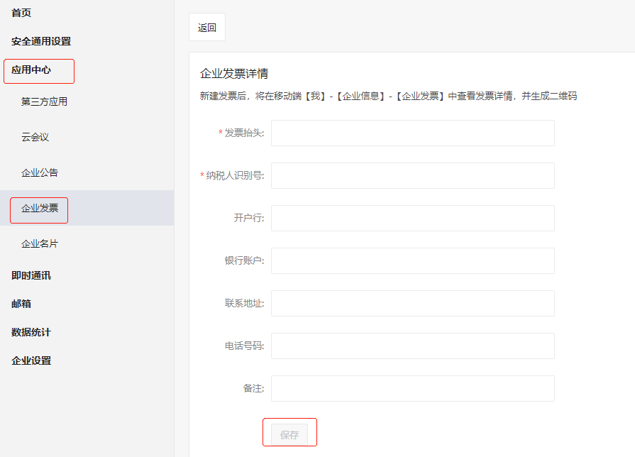 填写发票相关信息如发票抬头、纳税人识别号等,保存后,可在移动端【我】-【企业信息】-【企业发票】中查看发票详情;