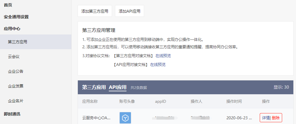 菜单路径:应用中心-第三方应用-选择组织-添加API应用。