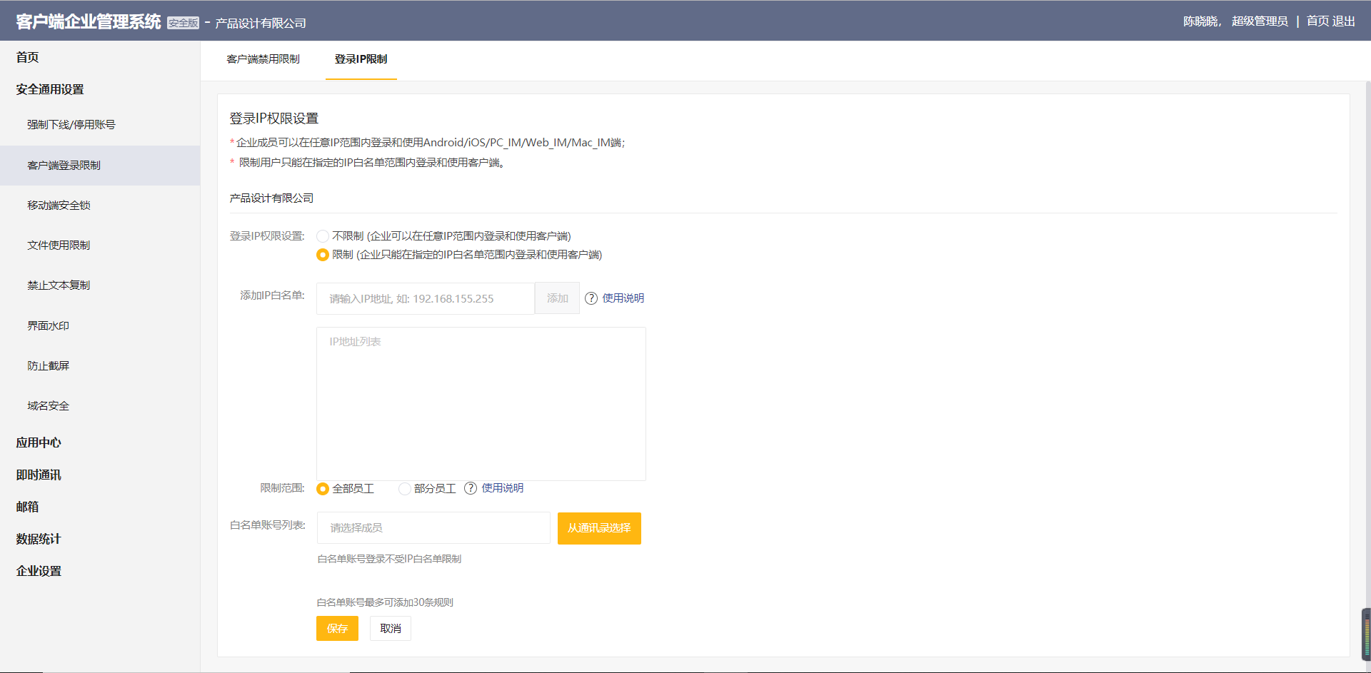 限制登录IP时,需填写IP白名单、限制范围,保存后,企业只能在指定的IP白名单范围内登录和使用客户端;