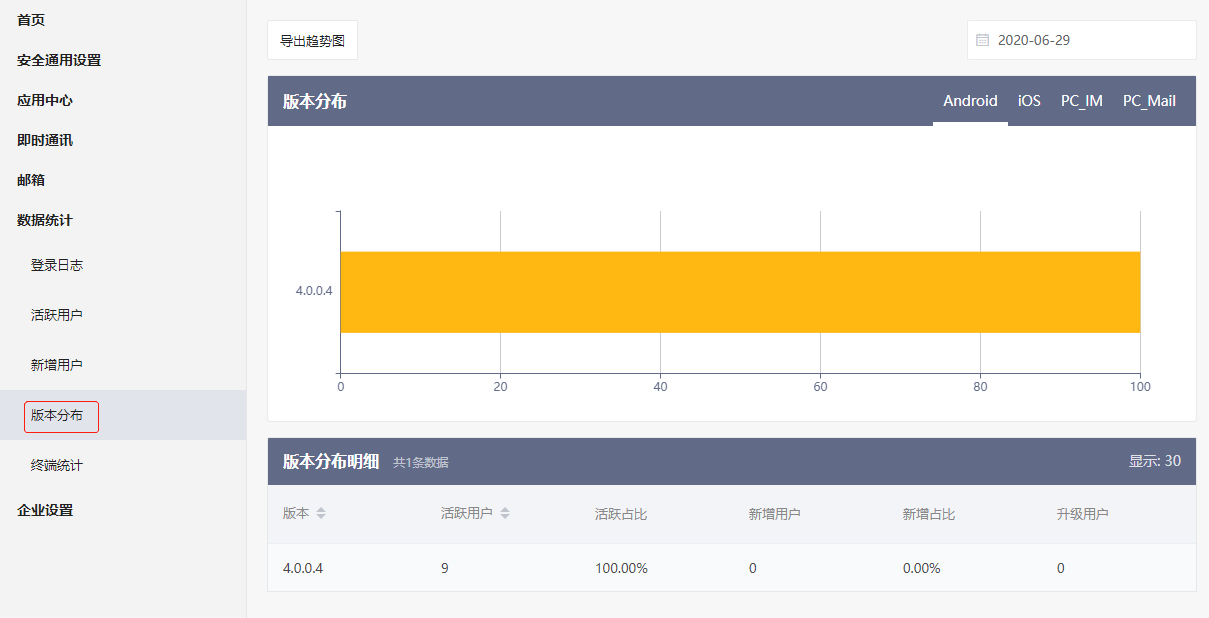 版本分布中,支持查看Android、ios、PC_IM、PC_Mail的版本活跃分布。